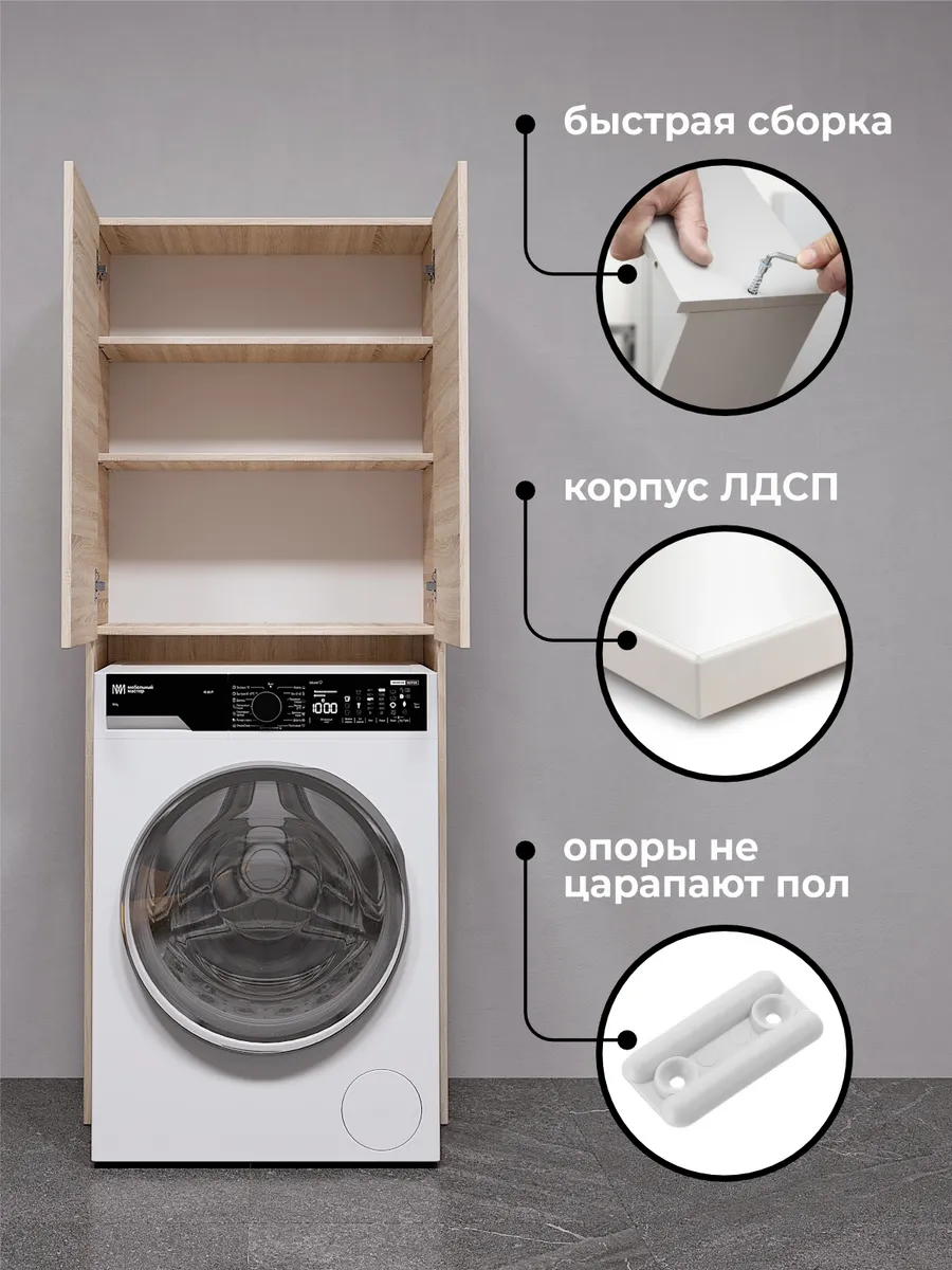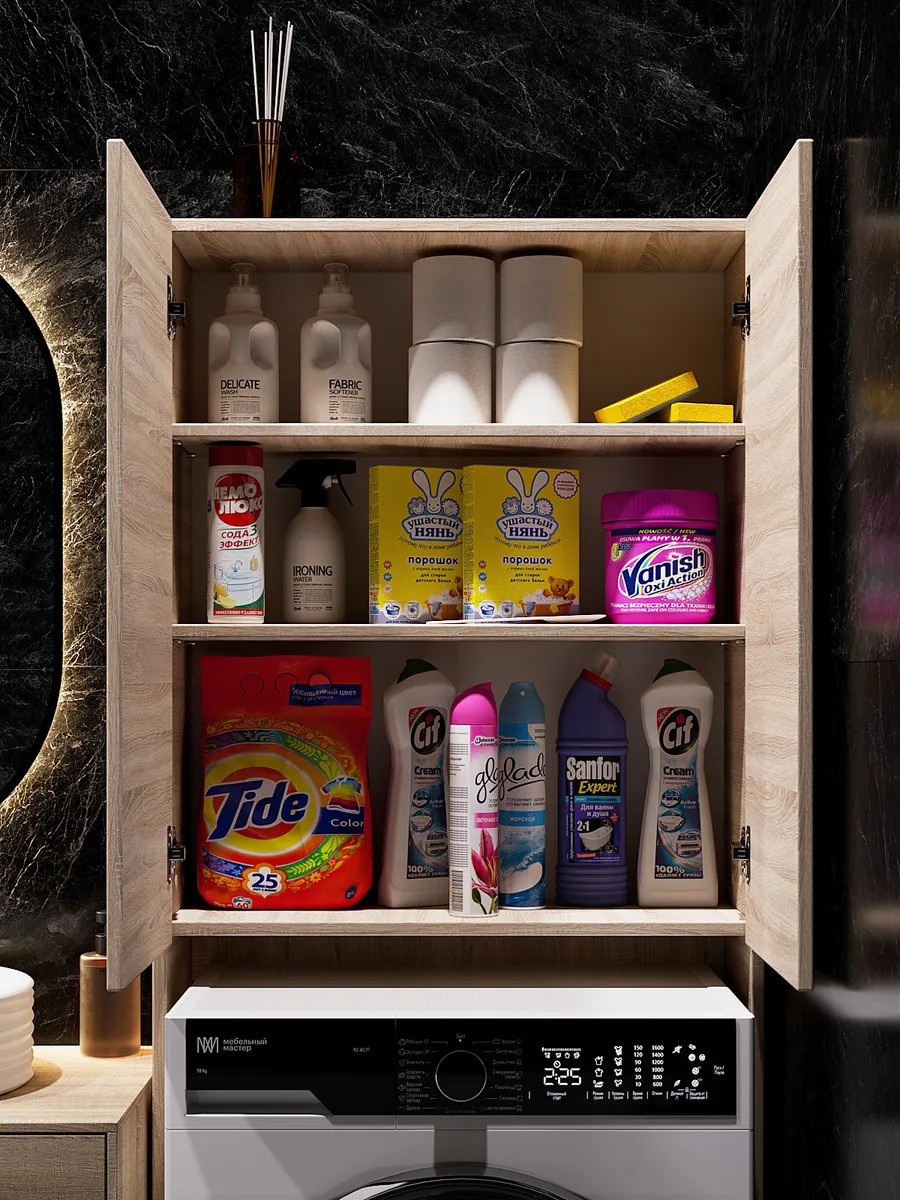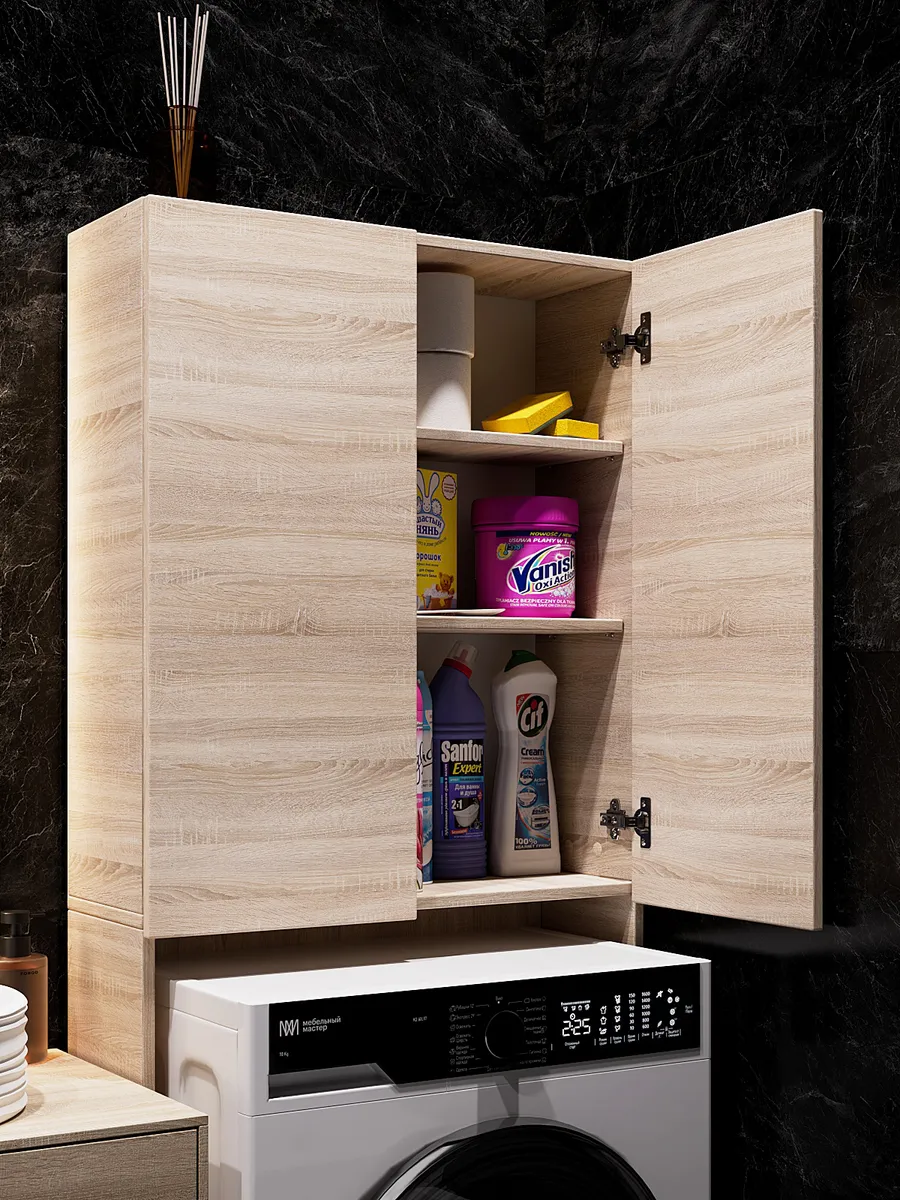 Конструкция шкафа специально разработана для установки над стиральной машиной, что делает его отличным вариантом для небольших ванных комнат. Он оснащен вместительными полками, которые обеспечивают достаточно места для хранения моющих средств, полотенец и других аксессуаров. Фокус на практичности и удобстве – это главные преимущества данной модели.