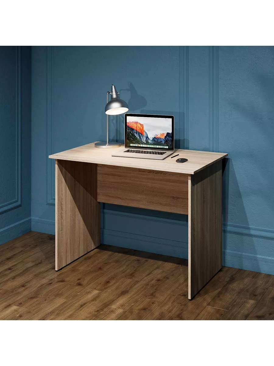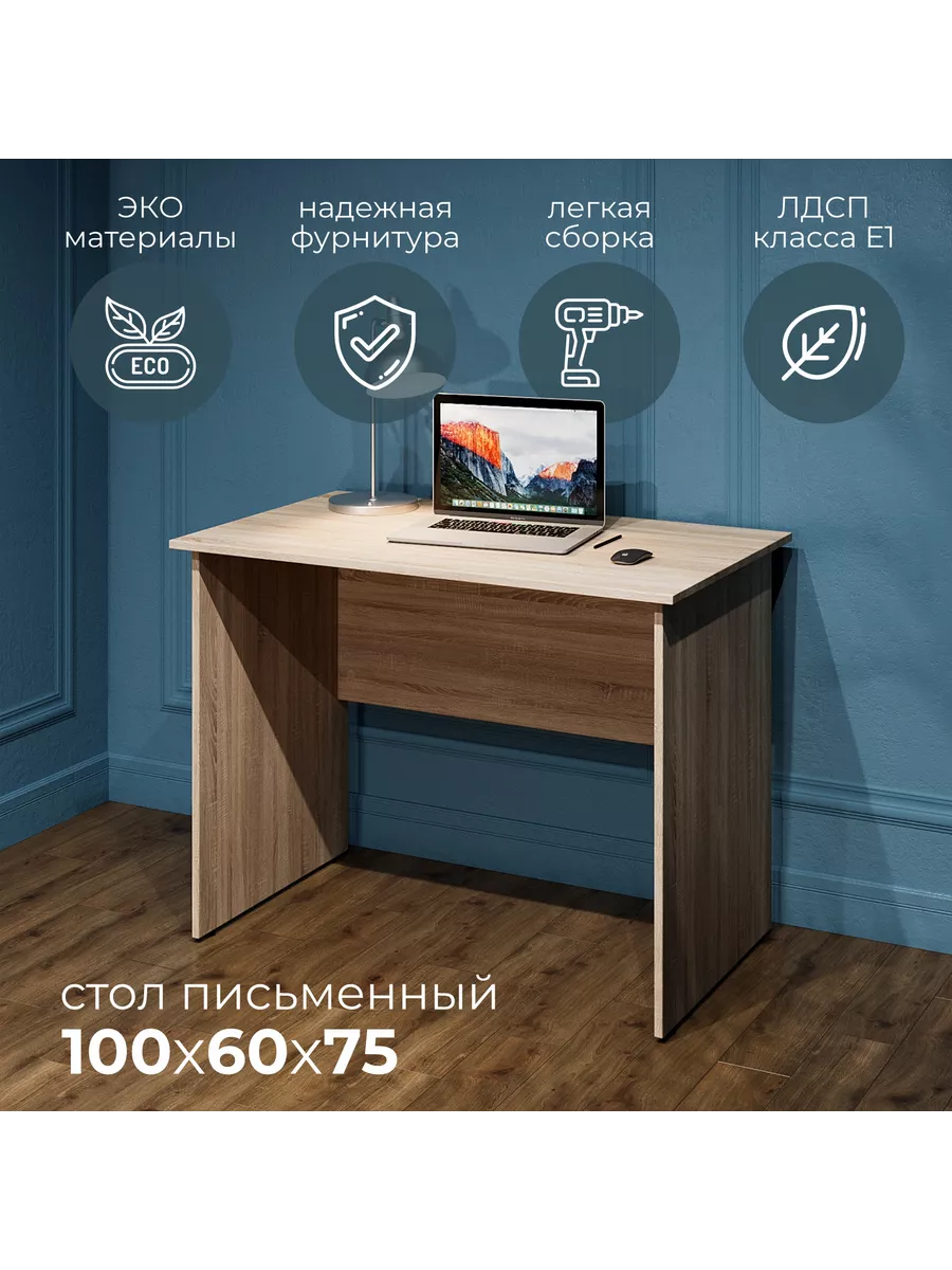 Стол выполнен из качественного материала, что позволяет ему выдерживать тяжелые нагрузки и иметь длительный срок службы. Столешница изготовлена из высококачественного ЛДСП, специальное ламинированное покрытие делает ее ударопрочной и не царапающейся, а также защищает от влаги. На широкой столешнице можно свободно разместить ноутбук, настольную лампу, письменные аксессуары и другие предметы, необходимые для работы. По краям ножек у стола установлена регулировка, которая позволяет выровнять стол, когда это необходимо, винты регулируются максимально на 20мм.